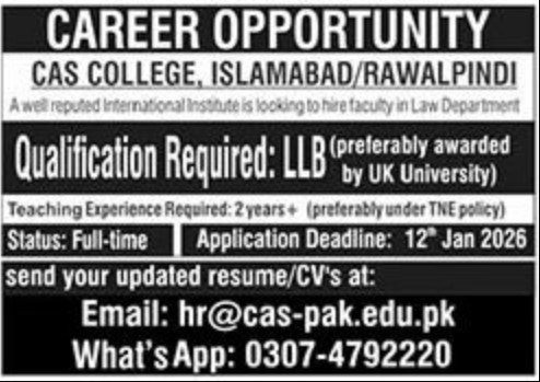 Candidates, if you are seeking CAS College Jobs 2025 in Islamabad Online Application yes. Then it would help if you tried to complete this CAS College Jobs because here you can easily apply for this vacancy: Faculty in the Law Department.