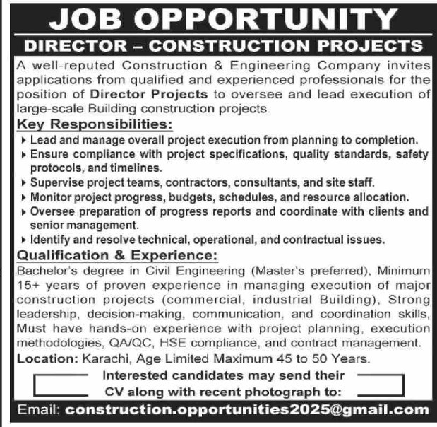 Both Male and Female candidates can apply for these Engineering Company Jobs who have the Qualification: Bachelor’s degree in Civil Engineering (Master’s preferred), Minimum 15+ years of proven experience in managing execution of major construction projects (commercial, industrial Building), Strong leadership, decision-making, communication, and coordination skills, Must have hands-on experience with project planning, execution methodologies, QA/QC, HSE compliance, and contract management. Location: Karachi, Age Limited Maximum of 45 to 50 Years, and many more experienced candidates should apply within 7 days.
