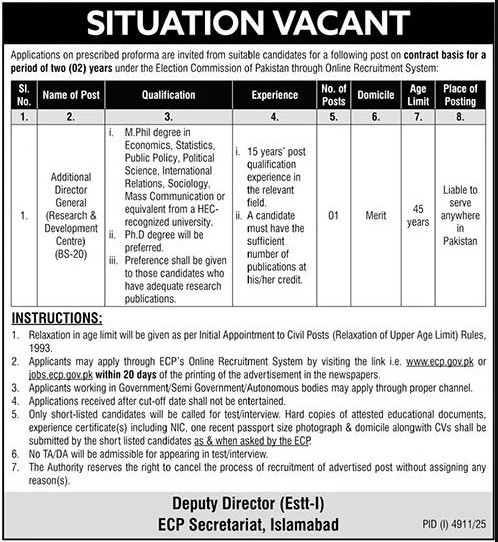 Candidates, if you are seeking Election Commission of Pakistan Jobs 2025 in Islamabad, yes. Then it would help if you tried to complete the Election Commission of Pakistan Jobs because here you can easily apply for this vacancy: Additional Director General (Research & Development Centre) (BS-20).