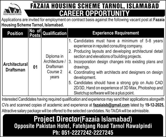 Both Male and Female candidates can apply for this Housing Scheme Tarnol Jobs who have the Qualification: Candidates must have a minimum of 5-8 years of experience in a reputed consulting company. Producing layouts and developing architectural detail sections and elevations of building projects. Incorporation of design changes into existing plans and drawings. Coordinating with architects and designers on design development. Candidates should have a strong grip on Auto CAD 2D/3D, Hands-on experience of 3D Max, Photoshop, and Sketchup software will be a plus point, and many more experienced candidates should apply before 19 December 2025.