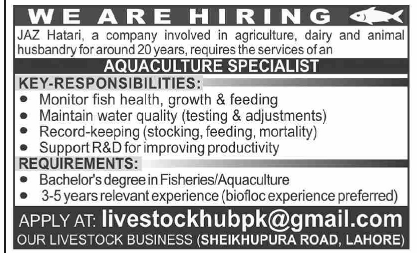 Candidates, if you are seeking JAZ Hatari Jobs 2025 in Lahore, the Online Application is yes. Then it would help if you tried to complete this JAZ Hatari Jobs because here you can easily apply for this vacancy: Aquaculture Specialist.