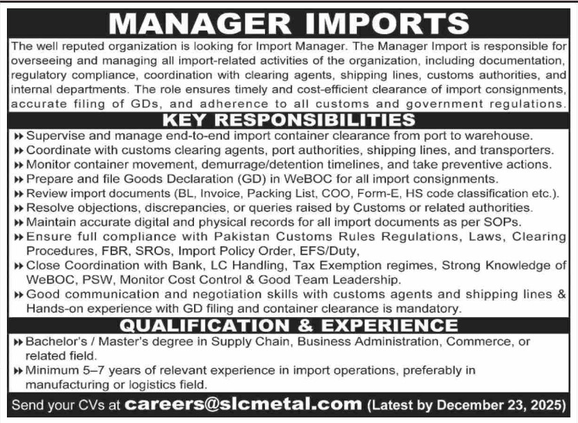 Both Male and Female candidates can apply for this Manager job who have a Qualification: a Bachelor’s/ Master’s degree in Supply Chain, Business Administration, Commerce, or a related field. Minimum 5-7 years of relevant experience in import operations, preferably in the manufacturing or logistics field, and many more experienced candidates should apply before 23 December 2025.