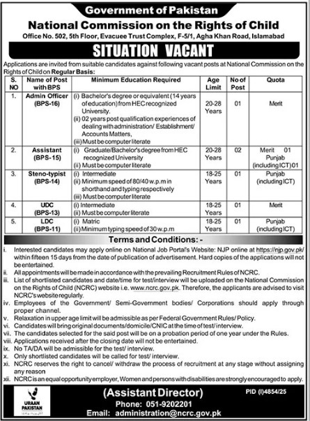 Candidates, if you are seeking National Commission on the Rights of the Child Jobs in 2025, apply online. Then it would help if you tried to complete this National Commission on the Rights of the Child Jobs because here you can easily apply for these vacancies: Admin Officer (BPS-16), Assistant (BPS-15), Steno-typist (BPS-14), UDC (BPS-1,3), LDC (BPS-11).